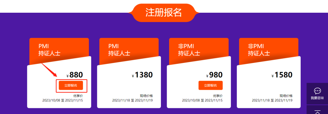 请参会者进入持证人报名窗口,点击折扣码,折扣码生效后,再进行下一步,报名时一定要填写PMI证书号码或者PMI ID,才能享受折扣报名。