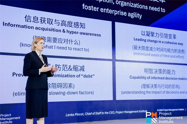 PMI Chief of Staff to the CEO Lenka Pincot女士发表《PMO在动荡世界中的破局之力》主题演讲,她强调,面对企业颠覆性变革加速的挑战(过去4年企业变革速度提升183%),PMO正逐渐成为组织敏捷转型的核心引擎。作为项目组合管理、项目执行和技能提升的核心部门,PMO在推动以价值为导向的项目成功,整合以人工智能和可持续战略驱动的工作方式,提升员工商业敏锐度、绿色技能等方面发挥着重要作用,是打造以人为本的敏捷型企业的最佳载体。
