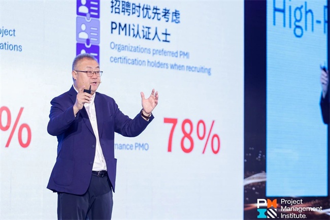 PMI副总裁、PMI(中国)董事总经理陈永涛先生随后发布《2025中国PMO发展调查报告》,他提到,今年的调查结果最令人惊喜的是组织内部设立PMO或同类机构的比例为历年最高(87%),其中高绩效PMO鼓励项目经理获取PMI认证和招聘时优先考虑PMI认证人士的比例高达86%和78%。此外,陈永涛先生还现场宣布了PMI官方小程序的正式上线,标志着PMI在中国大陆地区的数字化服务迈入新阶段。