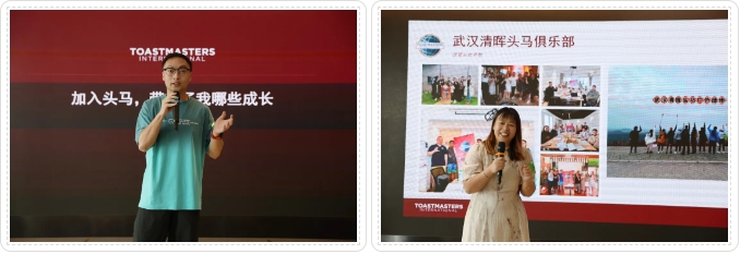 辜总监还特意邀请了武汉清晖头马俱乐部的两位会员代表——徐俊泽和易美军,上台分享他们在头马的学习经历和成长故事。他们用自己的亲身经历诠释了头马如何帮助个人克服演讲恐惧、提升沟通技巧、增强领导力。