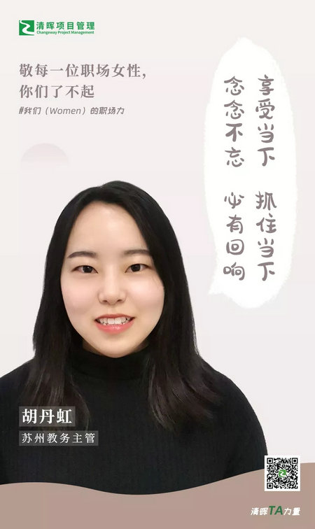 丹虹:目前主要负责管理苏州教务团队,包括昆山、常熟两地,而我本身也是一个教务班主任,平常自己也负责班级的管理。 丹虹:管理能力和专业知识的提升。清晖作为一家专业从事项目管理培训的公司,它给予了很多机会和资源,让我从项目管理的小白,成为持证带班的专业教务;清晖平台也让我接触到很多优秀的同事和学员,团队协作和人际交往能力都得到了很大的提升。而随着公司的不断壮大,我也一直在成长着。