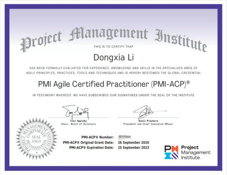 李冬霞:我考PMP时,出发点一是为了提升自己,二是为了工作,方便与学员之间的一个交流。后面再考ACP,也出于同样的原因。取得这两个证书,首先,解决了我工作中的专业问题,书中的一些专业名词,我知道是什么了,能适当的给学员一些建议了,还可以跟他们一起讨论题目,班主任的这个角色也更有参与性,使我持证上岗;另外,在我工作的时候,比以前有条理,懂得找方法,找原因,一些PMP和ACP中合适的工具,也可以适当地拿来运用,一步一步改进完善。