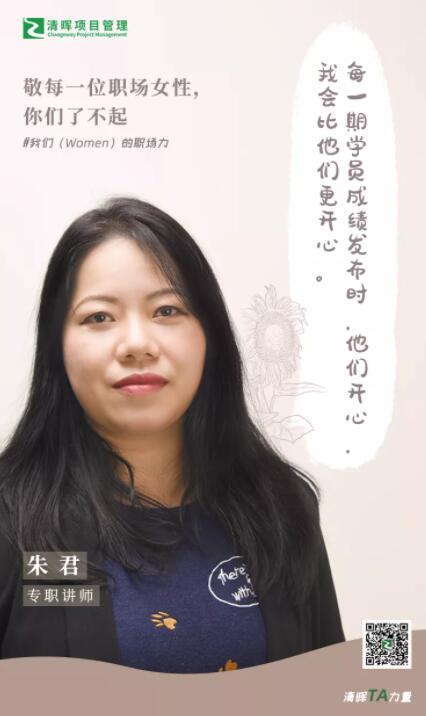 拥有十五年工作经验的朱君老师毕业之后做过高中老师、写过代码、做过测试、财务、人事,因为工作的原因接触了项目管理培训的工作,从此便走上培训讲师这条路。谈及工作中的困难,朱君老师都是一笑了之,只是觉得亏欠孩子。培训课程基本是在周末,有时候甚至还会出差,孩子要么就是拜托亲戚照顾,或者就带着他一起出差。很可惜不能在周末好好陪伴他。可说起来学员,朱君老师又觉得很开心。她说每一次学员出成绩时,考得好她会比学员更开心,这种巨大的荣誉感和自豪感,如果不是老师是很难体会到的。