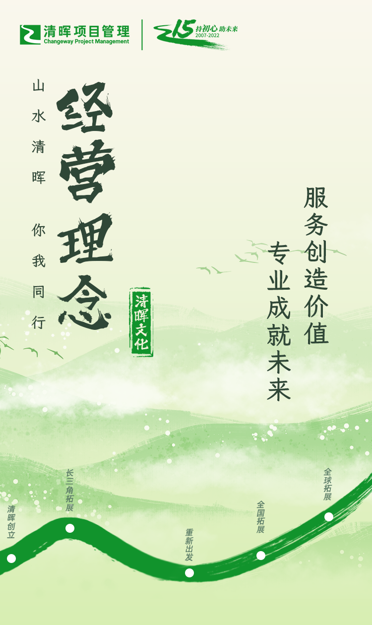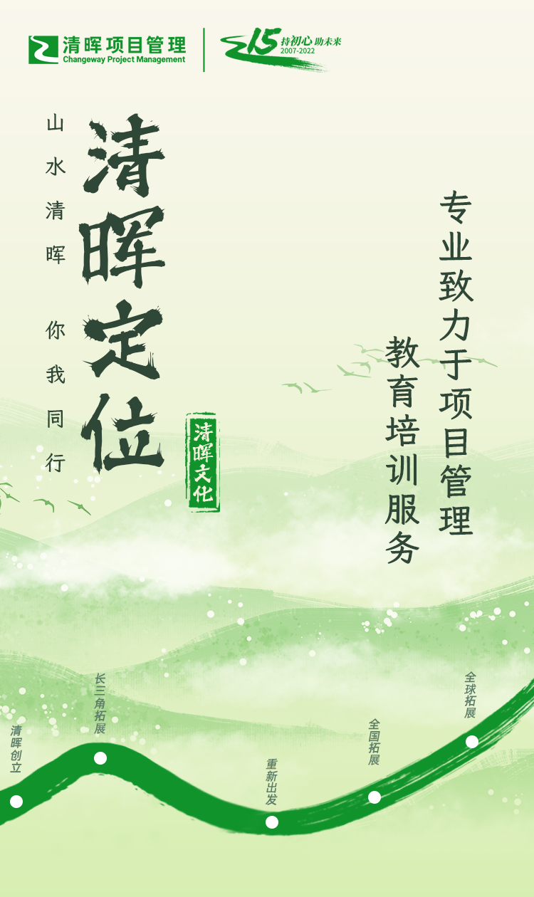 但实际上清晖品牌真正的起源是来自清晖英文“Changeway”的谐音,这个英文词是我早年创造并带入清晖的一个词,中英文之间几乎可完美地谐音,且英文本身也非常难得有很强的英文文化含义。最初创作这个词的背景,是当时还在从事IT职业教育培训创业,便取了“教育改变人生道路”的内在含义来创作该词。直到后来遇到了项目管理,才认识到项目与运营最大的不同,是项目因为变革而生之,顺应变革而为之,因此“变革之道”便是项目管理的底层逻辑,所以清晖的英文“Changeway”无意中也非常贴切地顺应了项目管理之道。这点在日后与国外项目管理同行交流时,便很能感受到对方几乎可以因这个名字而无缝理解清晖公司主业的便利。但在我最初创造这个词的时候其实还并没有这层语义联想,现在回过头来看,也算是一种天意巧合吧。