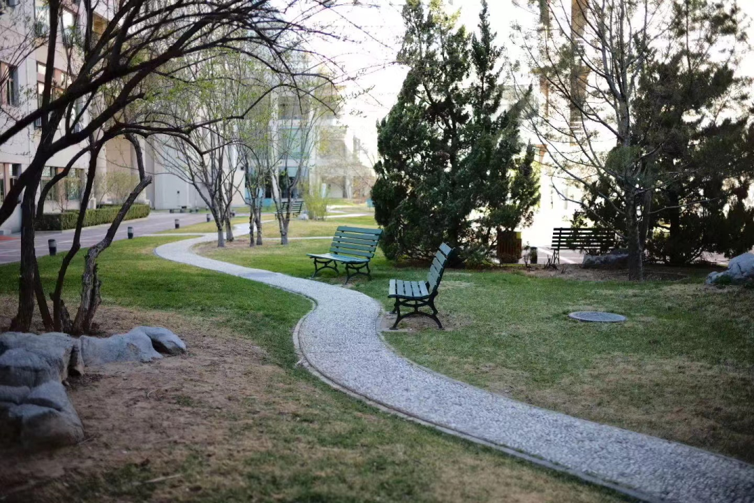 清晖Logo的这个曲折形状虽说有其自身的设计考虑,但也未见得有多么出奇。不过直到我第一次踏进清华经管学院伟伦楼与舜德楼之间的庭院时,看到这扑面映入眼帘的如同清晖Logo一般的林间小道(见图4),我几乎完全惊呆并驻足良久,内心瞬间有一种无比的震撼与感动,才突然间真正明白它对我的人生意义!所谓人生何处不相逢,大概莫过于此。