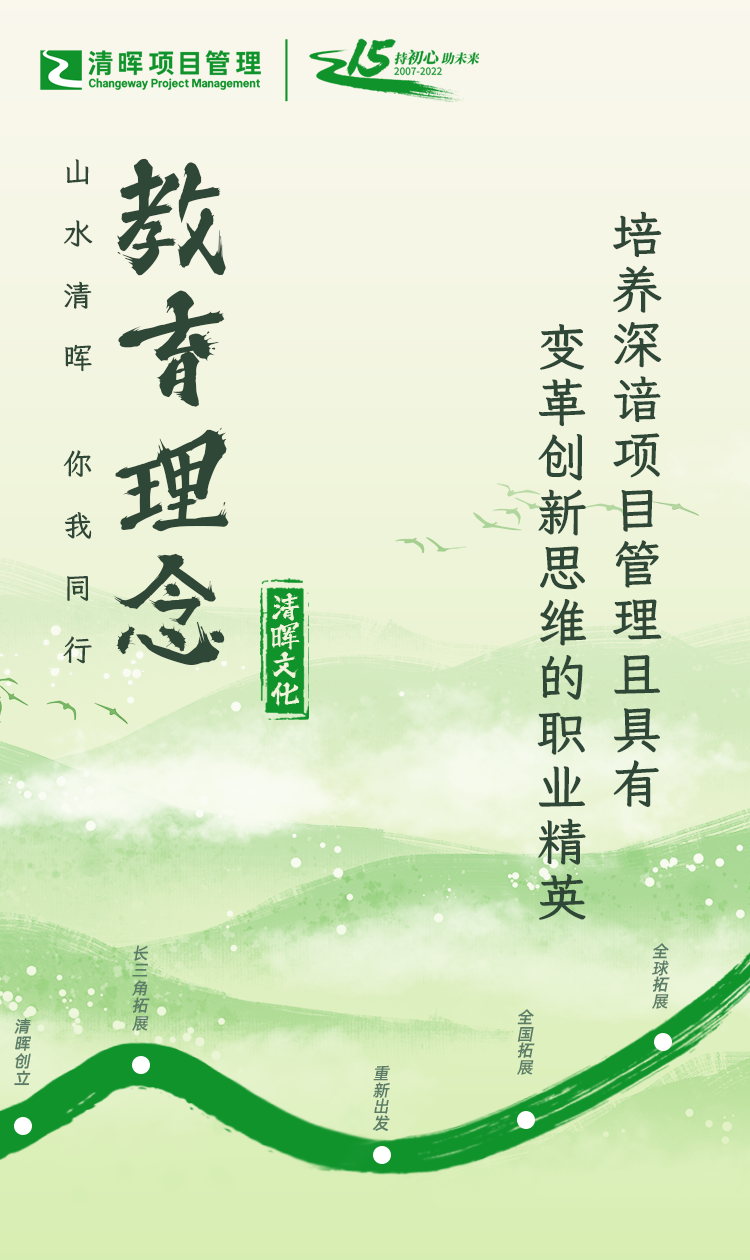 时光飞逝如电!十五年对于清晖而言,从初创时在上海徐家汇的一个PMP班级,发展到全国四十多个城市100多个PMP班级,从单纯的线下课程发展到线下线上平台并举,培训产品从单一的PMP认证,发展到目前十二门项目管理相关国际国内认证,以及企业内训和咨询服务。团队也从无到有,从震荡到规范,逐渐发展到如今分布在全国的三百多人的一个清晖大家庭。通过十五年的努力,清晖在项目管理教育培训细分市场领域总算做出了一点小成绩,也总算初步实现了当初创业时的一点小心愿。