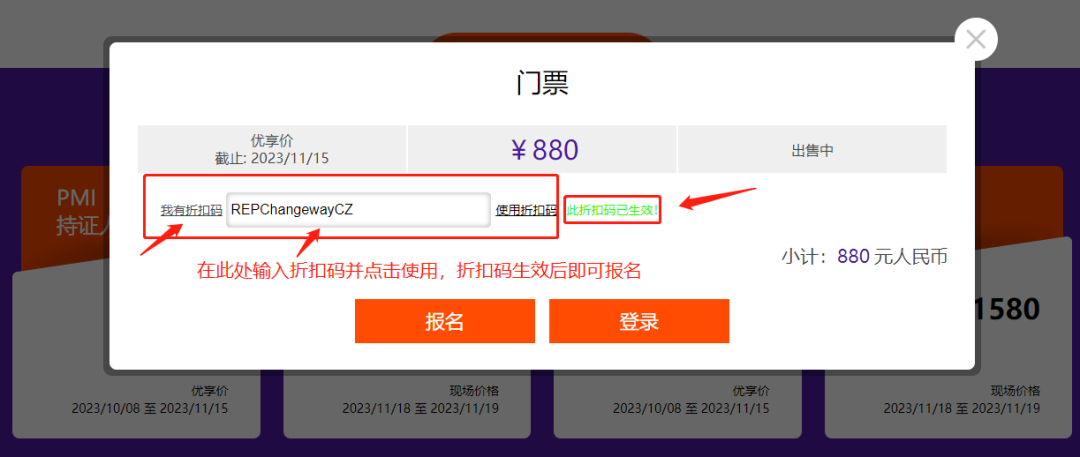 请参会者进入持证人报名窗口,点击折扣码,折扣码生效后,再进行下一步,报名时一定要填写PMI证书号码或者PMI ID,才能享受折扣报名。