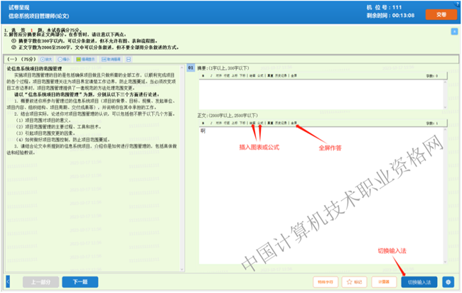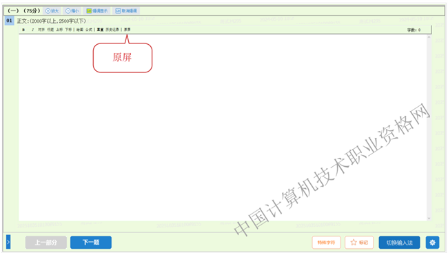 论文题,可以通过点击“全屏”按钮,全屏作答。“全屏”按钮将变更为“原屏”按钮,点“原屏”按钮则可以返回。