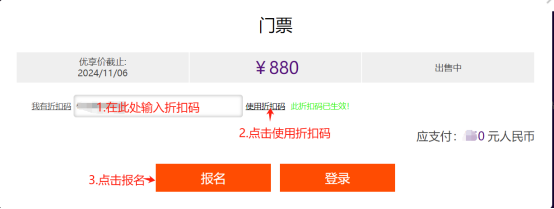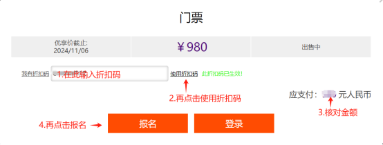 请参会人直接进入非持证人报名窗口,点击使用折扣码,折扣码生效后,进行下一步报名即可。
