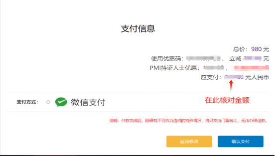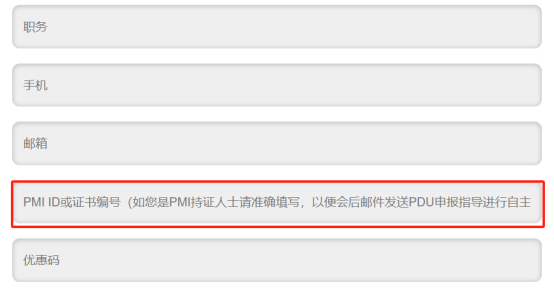 请参会者进入持证人报名窗口,点击折扣码,折扣码生效后,再进行下一步,报名时一定要填写PMI证书号码或者PMI ID,才能享受折扣报名。