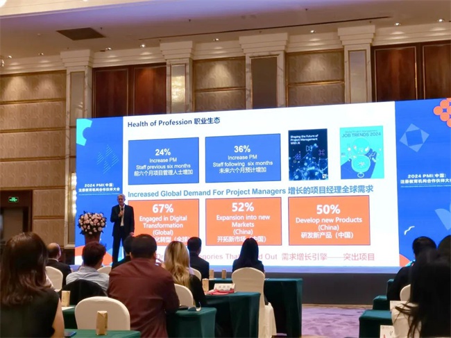 随后,PMI首席产品官Mark Broome先生进行了主题演讲,深入探讨了PMI的全球发展动态,并着重分享了项目经理在全球范围内的持续增长需求,以及人工智能(AI)的需求和期望。他强调了项目管理在当今快速变化的世界中的重要性,并预测了AI在未来项目管理中的潜在影响和发展趋势。这次演讲不仅为与会者提供了宝贵的行业洞察,也激发了大家对项目管理及AI技术应用的深入思考。