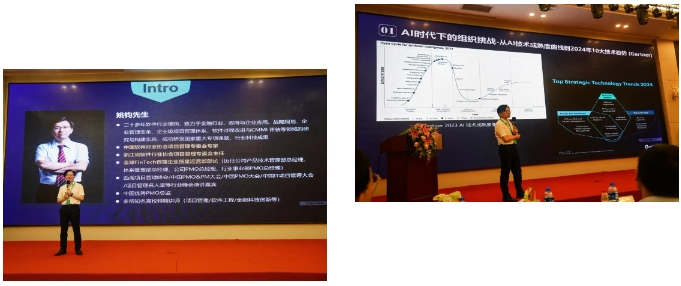 随后,浙江省软件行业协会项目管理专委会主任姚钧先生发表了主题演讲《AI时代下的项目管理促进组织创新,助力新质生产力发展》。他探讨了人工智能时代项目管理的新挑战和机遇,并提出项目管理促进组织创新的方法和思路。