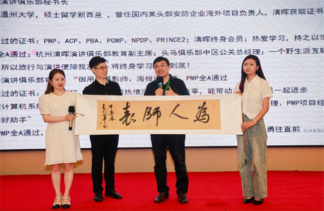惊喜环节!清晖PMP2308杭州西溪班学员王仁军给傅老师送上了字画《为人师表》,表达了对傅老师的崇敬之意。