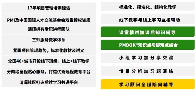 清晖PMP课程采取线上+线下相结合的模式,帮助学员深入理解《项目管理知识体系指南(PMBOK®指南)》(第6版、第7版)、项目管理五大过程组、十大知识领域及49个过程、敏捷项目管理基础、十二大原则与八大绩效域。