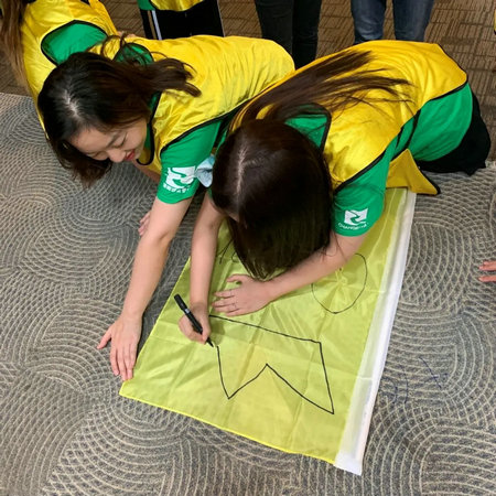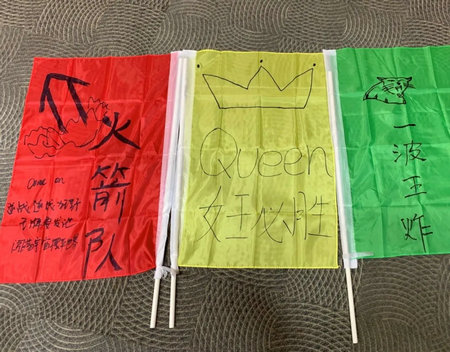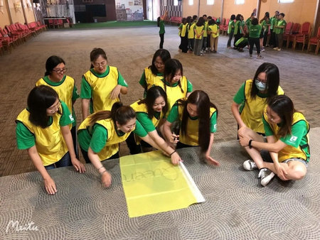 第一轮游戏要求三个小组分别设计出自己团队的队旗、队歌、队形、口号,经过五分钟的紧张准备后,各小组开始展示自己的成果。