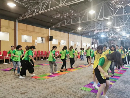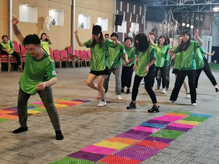 第三组游戏是夹气球在指压板上光脚往返接力跑,刚开始试玩时大家一踩上去都直呼痛!痛!痛!但是等到游戏真正开始后,为了团队的荣誉大家都拼尽全力快速来回奔跑,谁也不肯多耽误一秒。