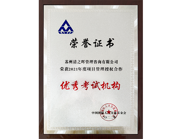 清晖凭借优质的教学、培训服务和专业的考试服务荣获由中国国际人才交流基金会颁发的2021年度项目管理授权合作优秀考试机构奖。