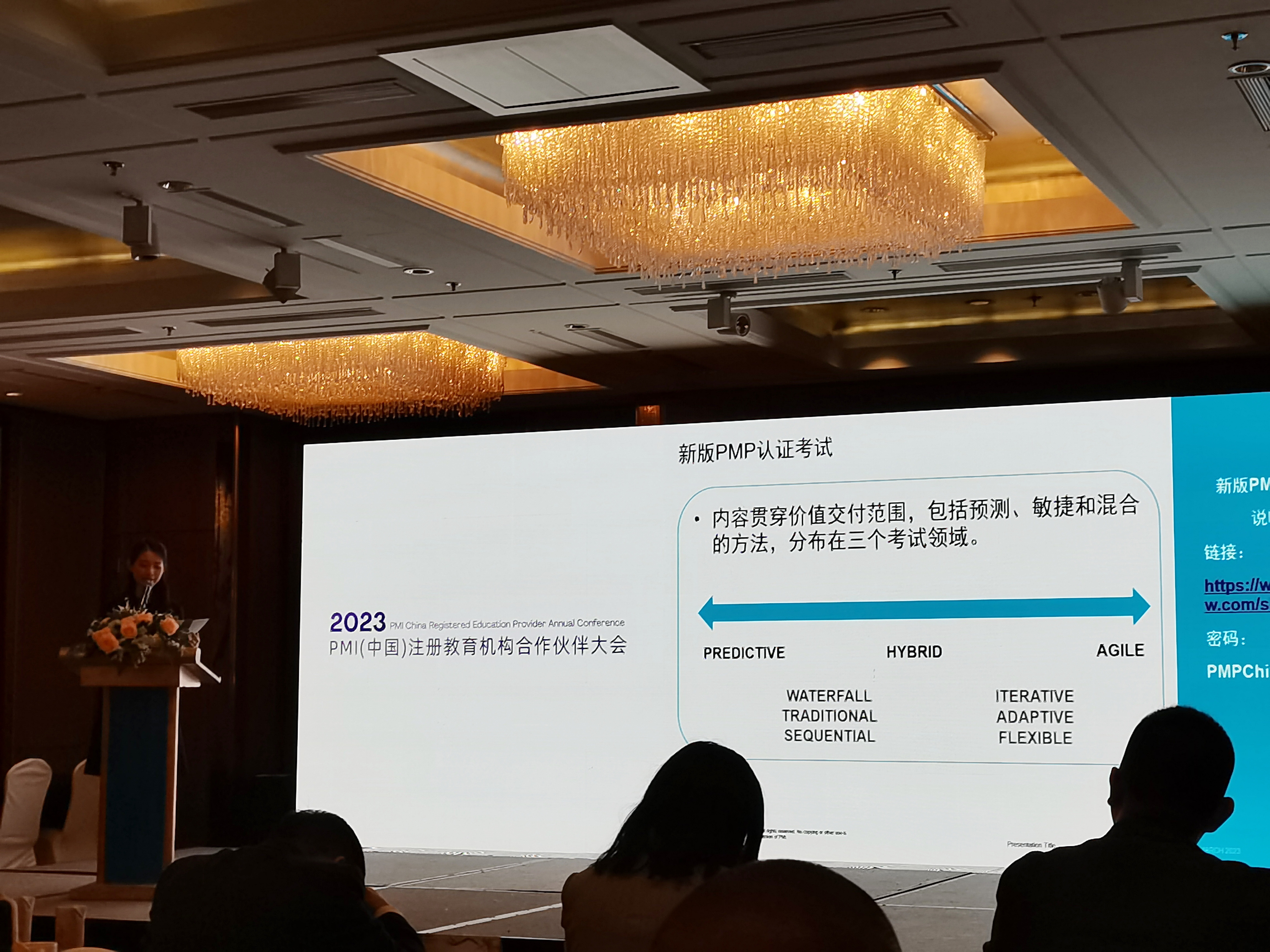 随后,PMI(中国)渠道部经理邵华嫣女士对PMI全球发展做了分享,介绍了新版PMP认证考试内容贯穿价值交付范围,包括预测、敏捷和混合的方法,分布在三个考试领域。新版人才三角:Ways of Working工作方式、Power Skills影响力技能、Business Acumen商业敏锐度。