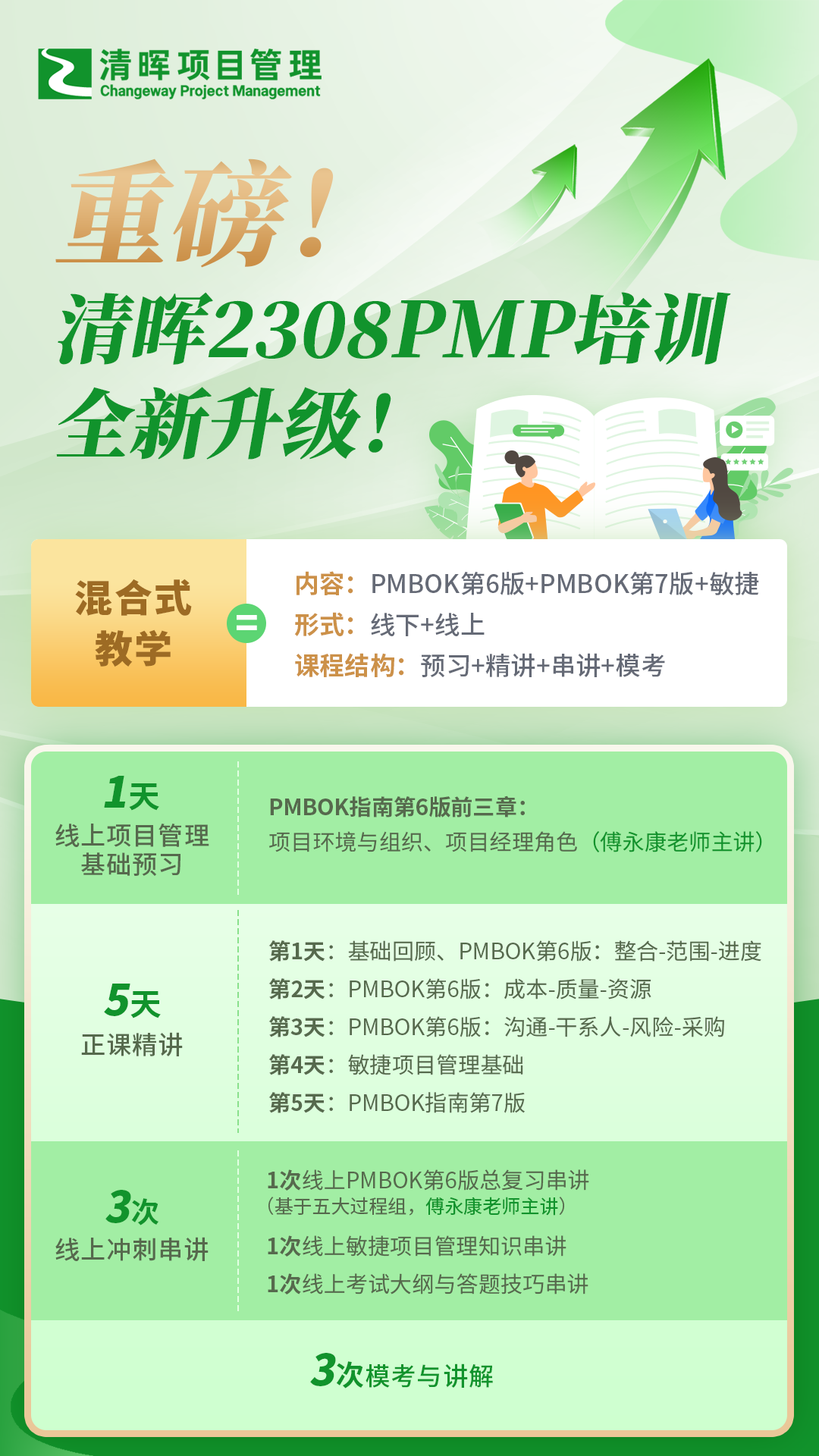 8月考试增加PMBOK第7版为指定教材,清晖PMP培训也随之全面升级!采用全新混合式教学:PMBOK第6版+敏捷项目管理+PMBOK第7版!