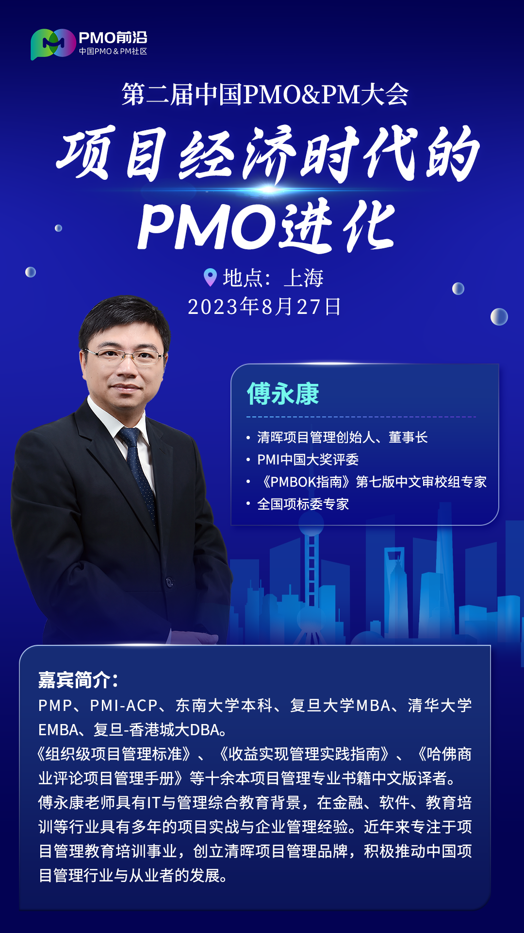 清晖创始人、董事长傅永康受PMO前沿邀请,8月27日将在第二届中国PMO&PM大会上海会场做演讲分享,演讲主题为《项目经济时代的PMO进化》。