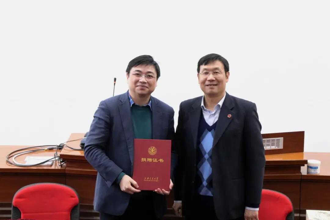 双方发言后签约正式开始,傅永康先生与王皓院长进行奖学金捐赠文件签署,随后王皓院长代表交大机动学院为清晖公司颁发捐赠证书,傅永康先生代表清晖赠与机动学院一套由清晖翻译出版的项目管理书籍。