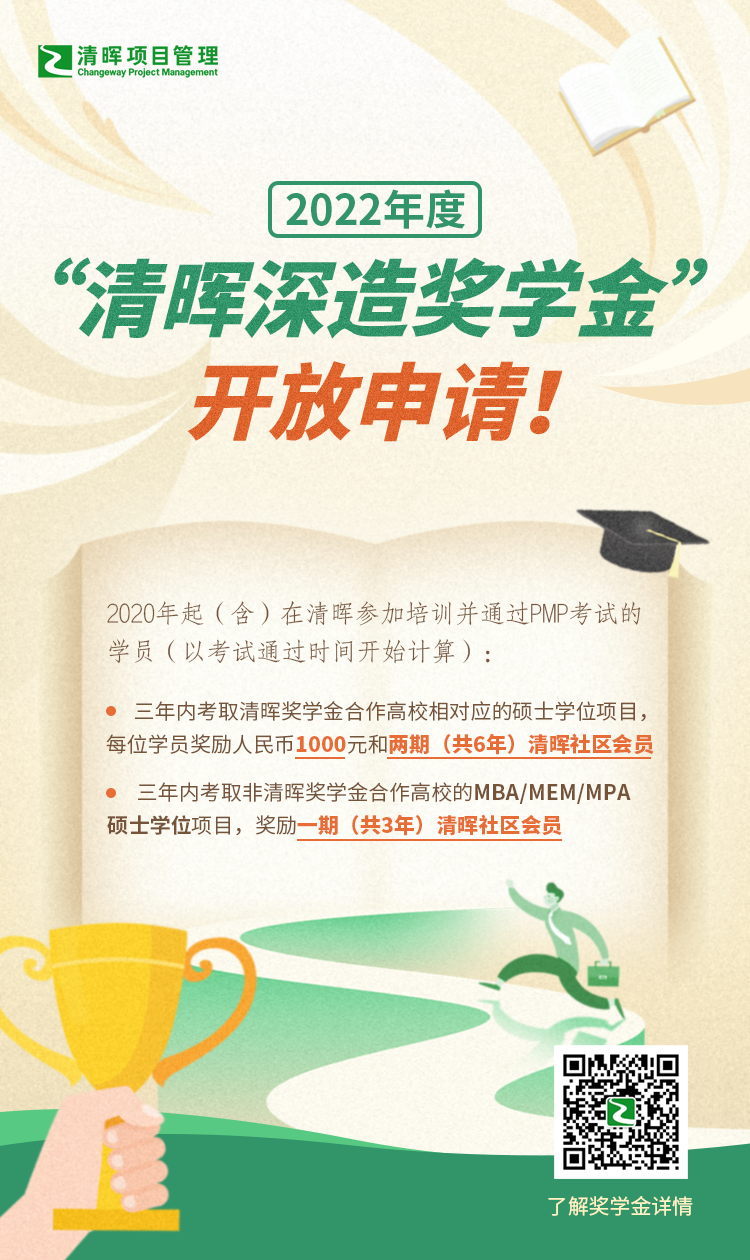 为进一步促进校企合作,激发清晖PMP学员持续学习深造的热情,践行清晖“培养深谙项目管理且具有变革创新思维的职业精英”的教育理念。发布面向清晖PMP学员的“清晖深造奖学金”计划。